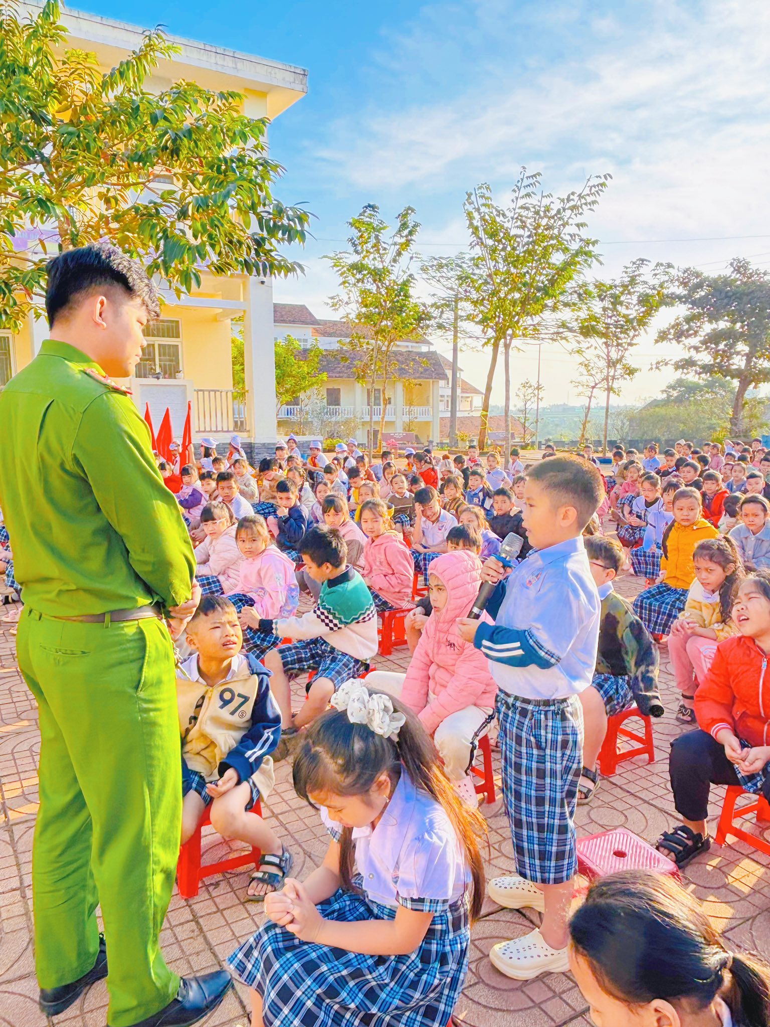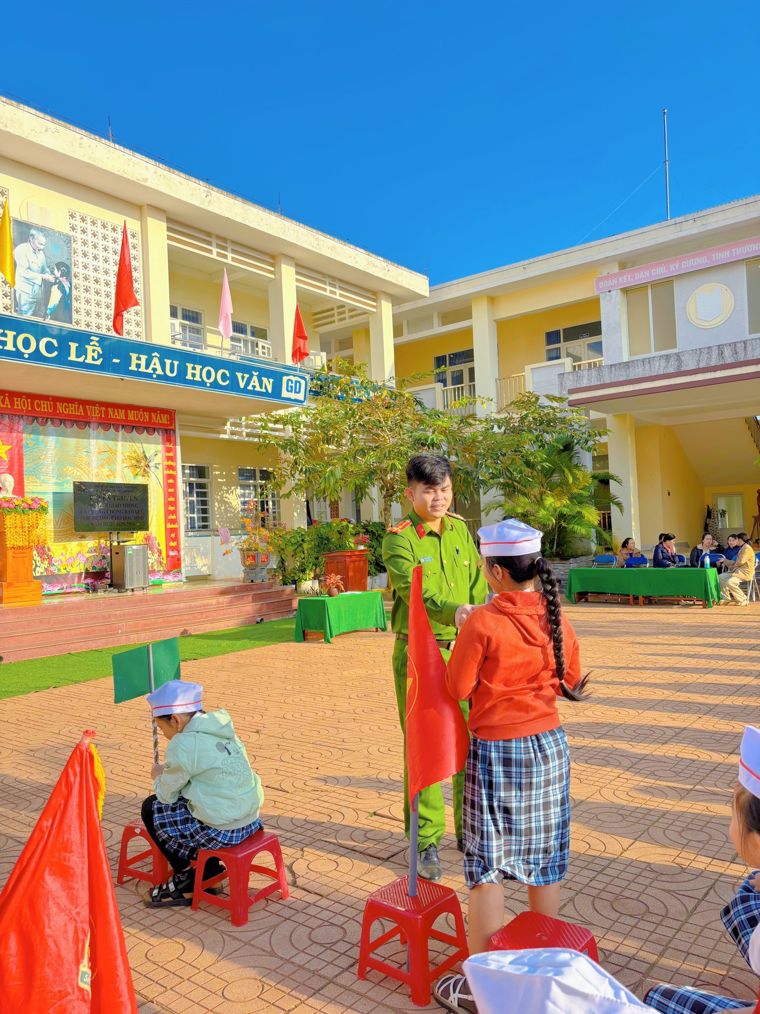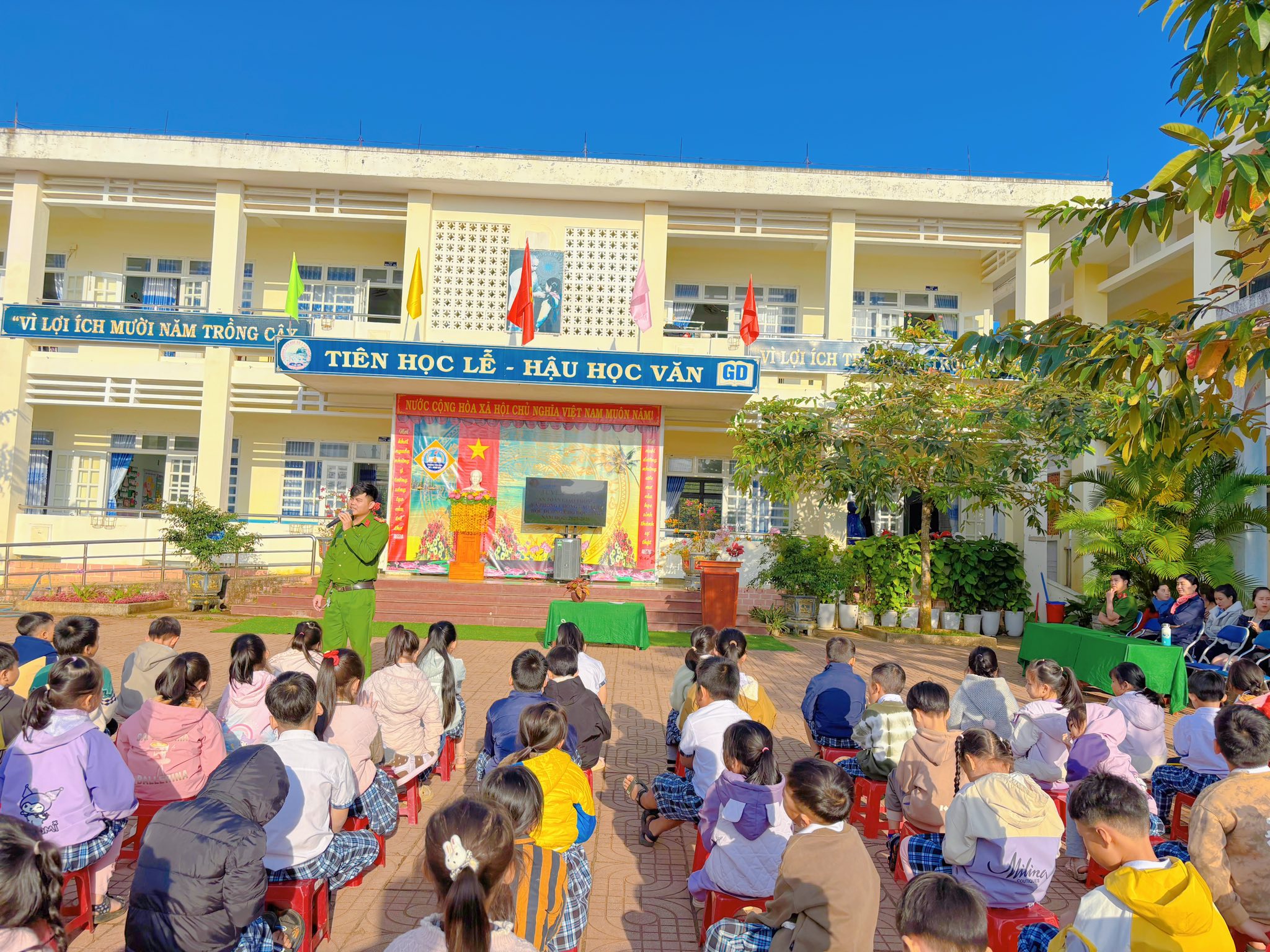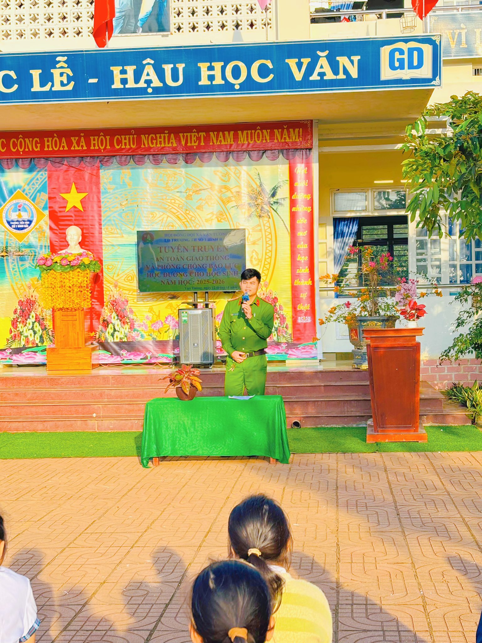 Sáng thứ Hai, ngày 12/01/2026, tại Trường TH số 1 Bình Hải, trong buổi sinh hoạt dưới cờ đầu tuần, cán bộ Công an xã Vạn Tường đã trực tiếp tuyên truyền, phổ biến đến học sinh những nội dung quan trọng về an toàn giao thông và phòng, chống bạo lực học đường.