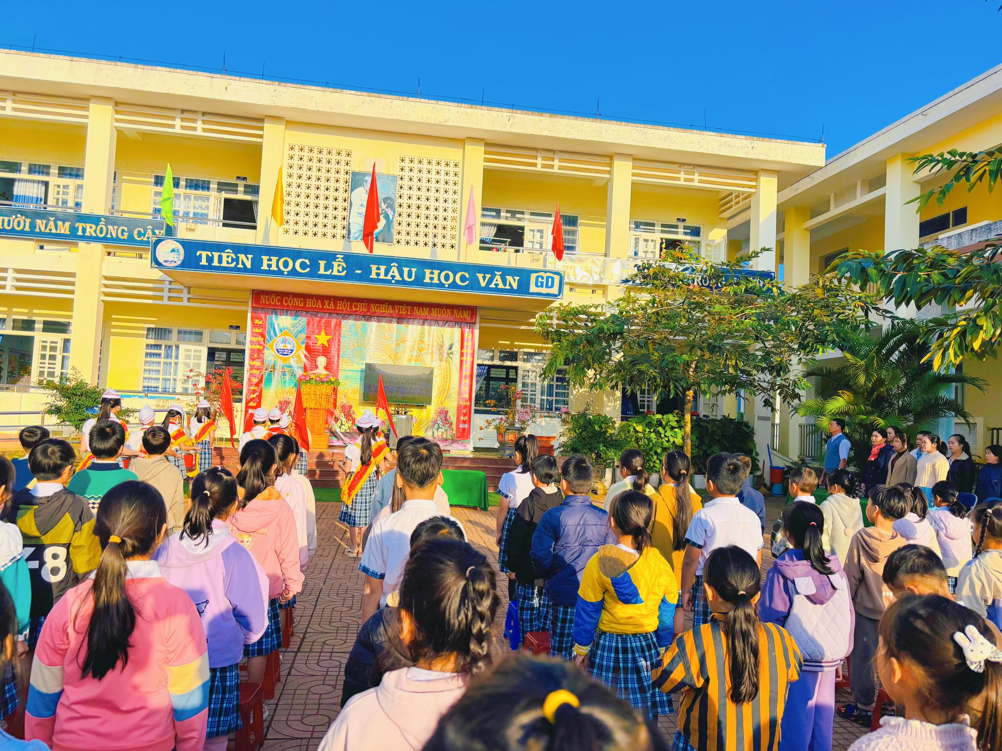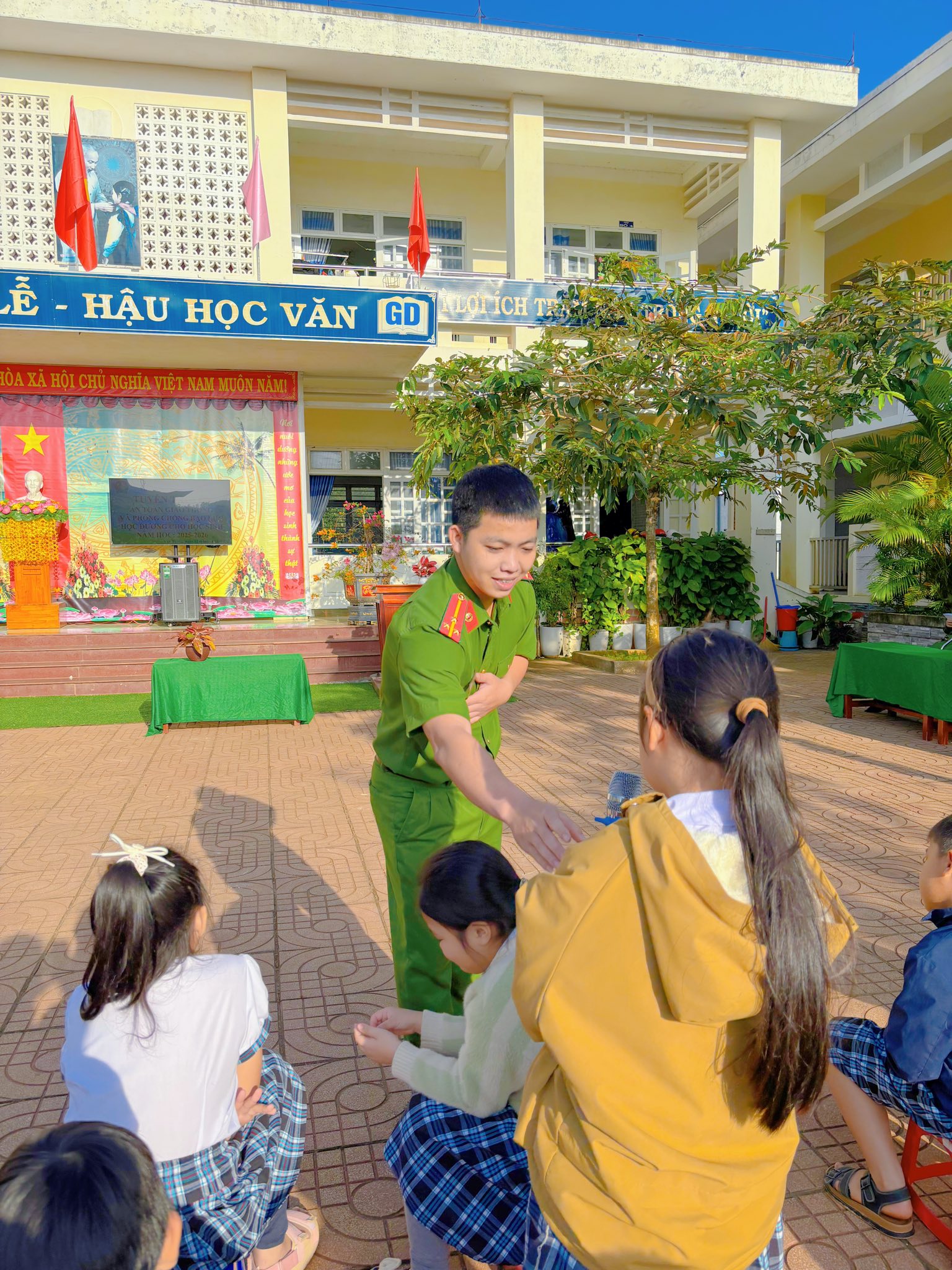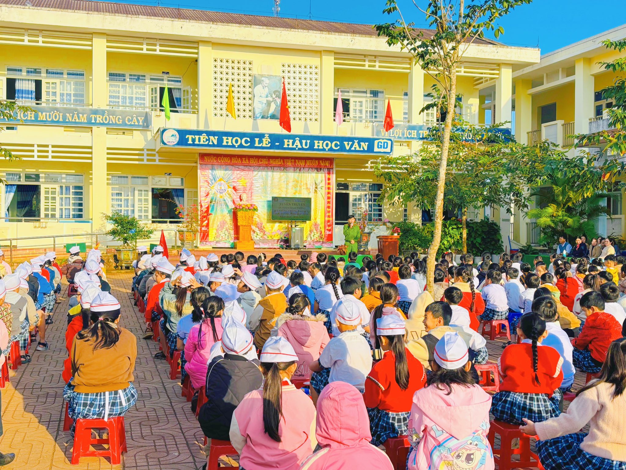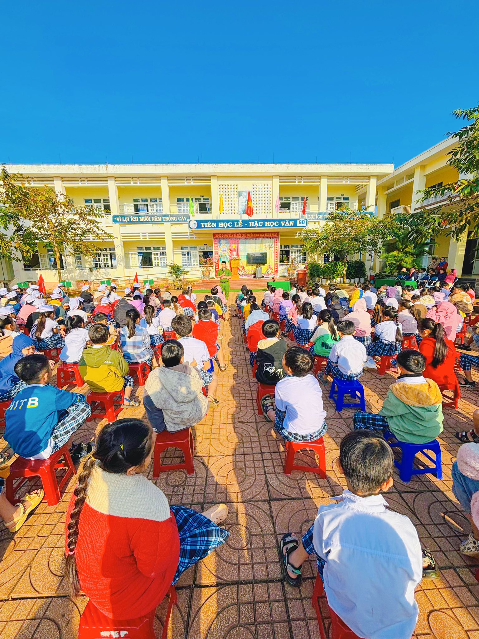 Sáng thứ Hai, ngày 12/01/2026, tại Trường TH số 1 Bình Hải, trong buổi sinh hoạt dưới cờ đầu tuần, cán bộ Công an xã Vạn Tường đã trực tiếp tuyên truyền, phổ biến đến học sinh những nội dung quan trọng về an toàn giao thông và phòng, chống bạo lực học đường.